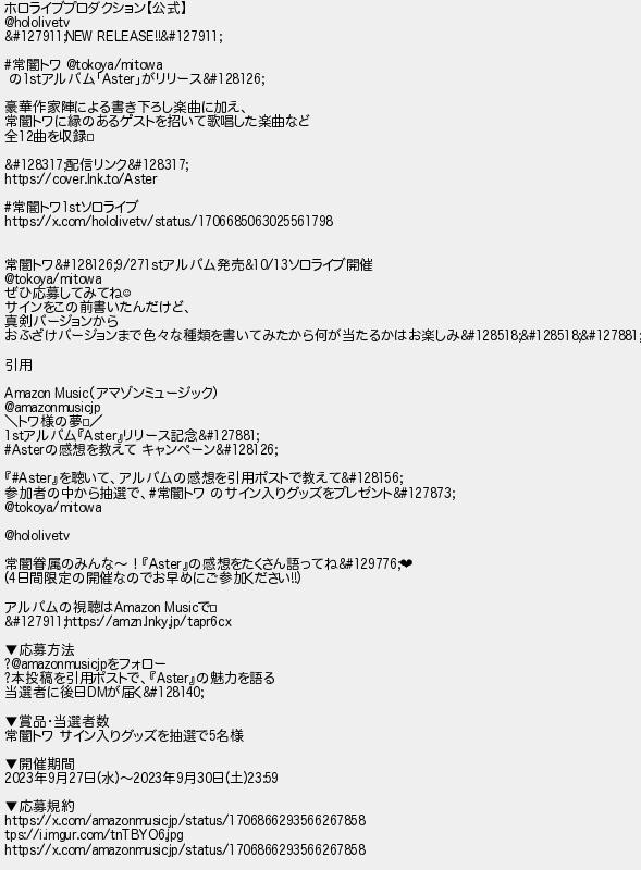 35: (スップ Sd12-XvVa [1.72.9.39]) [] 2023/09/28(木) 01:01:20.86 ID:4hpiY6lId ホロライブプロダクション【公式】 @hololivetv 🎧NEW RELEASE!!🎧 #常闇トワ @tokoya/mitowa の1stアルバム「Aster」がリリース👾 豪華作家陣による書き下ろし楽曲に加え、 常闇トワに縁のあるゲストを招いて歌唱した楽曲など 全12曲を収録✨ 🔽配信リンク🔽 https://cover.lnk.to/Aster #常闇トワ1stソロライブ https://x.com/hololivetv/status/1706685063025561798 常闇トワ👾9/271stアルバム発売&10/13ソロライブ開催 @tokoya/mitowa ぜひ応募してみてね☺ サインをこの前書いたんだけど、 真剣バージョンから おふざけバージョンまで色々な種類を書いてみたから何が当たるかはお楽しみ😆😆🎉 引用 Amazon Music(アマゾンミュージック) @amazonmusicjp \トワ様の夢✨/ 1stアルバム『Aster』リリース記念🎉 #Asterの感想を教えて キャンペーン👾 『#Aster』を聴いて、アルバムの感想を引用ポストで教えて💜 参加者の中から抽選で、#常闇トワ のサイン入りグッズをプレゼント🎁 @tokoya/mitowa @hololivetv 常闇眷属のみんな〜!『Aster』の感想をたくさん語ってね🫰❤ (4日間限定の開催なのでお早めにご参加ください!!) アルバムの視聴はAmazon Musicで✅ 🎧https://amzn.lnky.jp/tapr6cx ▼応募方法 ?@amazonmusicjpをフォロー ?本投稿を引用ポストで、『Aster』の魅力を語る 当選者に後日DMが届く💌 ▼賞品・当選者数 常闇トワ サイン入りグッズを抽選で5名様 ▼開催期間 2023年9月27日(水)〜2023年9月30日(土)23:59 ▼応募規約 https://x.com/amazonmusicjp/status/1706866293566267858 tps://i.imgur.com/tnTBYO6.jpg https://x.com/amazonmusicjp/status/1706866293566267858 http://egg.5ch.net/test/read.cgi/streaming/1695818708/35