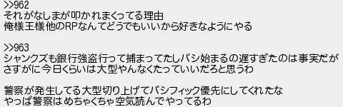 それがなしまが叩かれまくってる理由 俺様王様他のなんてどうでもいいから好きなようにやる シャンクズも銀行強盗行って捕まってたしパシ始まるの遅すぎたのは事実だが さすがに今日くらいは大型やんなくたっていいだろと思うわ 警察が発生してる大型切り上げてパシフィック優先にしてくれたな やっぱ警察はめちゃくちゃ空気読んでやってるわ
