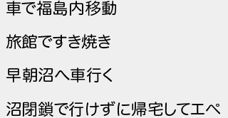 車で福島内移動 旅館ですき焼き 早朝沼へ車行く 沼閉鎖で行けずに帰宅してエペ