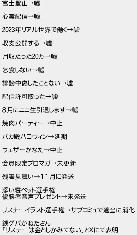富士登山嘘 心霊配信嘘 年リアル世界で働く嘘 収支公開する嘘 月収たった万嘘 乞食しない嘘 誹中傷したことない嘘 配信許可取った嘘 8月にニコ生引退します嘘 焼肉パーティー中止 バカ殿ハロウィン延期 ウェザーかなた中止 会員限定ブロマガ未更新 残暑見舞い11月に発送 添い寝ベット選手権 優勝者音声プレゼント未発送 リスナーイラスト選手権サブコミュで適当に消化 銭ゲバかねたさん リスナーは金としかみてないとにて表明