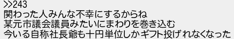 関わった人みんな不幸にするからね 某元市議会議員みたいにまわりを巻き込む 今いる自称社長爺も十円単位しかギフト投げれなくなった
