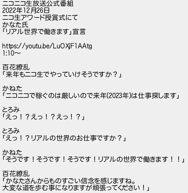 ニコニコ生放送公式番組 年月日 ニコ生アワード授賞式にて かなた氏 リアル世界で働きます宣言 百花乱 来年もニコ生でやっていけそうですか? かねた ニコニコで稼ぐのは厳しいので来年年は仕事探します とろみ えっ!?えっ!?えっ!? とろみ えっ!?リアルの世界のお仕事ですか? かねた そうです!そうです!そうです!リアルの世界で働きます!! 百花乱 かなたさんからものすごい信念を感じますね 大変な道を歩む事になりますが頑張ってください!
