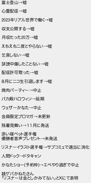 富士登山嘘 心霊配信嘘 年リアル世界で働く嘘 収支公開する嘘 月収たった万嘘 えちえち二度とやらない嘘 乞食しない嘘 誹中傷したことない嘘 配信許可取った嘘 8月にニコ生引退します嘘 焼肉パーティー中止 バカ殿ハロウィン延期 ウェザーかなた中止 会員限定ブロマガ未更新 残暑見舞い11月に発送 添い寝ベット選手権 優勝者音声プレゼント未発送 リスナーイラスト選手権サブコミュで適当に消化 人間ドックドタキャン かなたショー予約枠エペやり過ぎで中止 銭ゲバかねたさん リスナーは金としかみてないとにて表明
