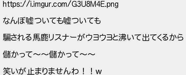 なんぼ嘘ついても嘘ついても される馬鹿リスナーがウヨウヨと沸いて出てくるから 儲かって儲かって 笑いが止まりませんわ!!
