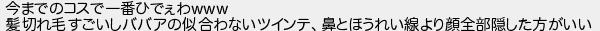 今までのコスで一番ひでぇわ 髪切れ毛すごいしババアの似合わないツインテ鼻とほうれい線より顔全部隠した方がいい