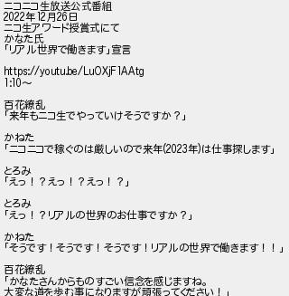 615: [] 2023/12/14(木) 06:40:45.53 ID:IT4iWE9k0 ニコニコ生放送公式番組 2022年12月26日 ニコ生アワード授賞式にて かなた氏 「リアル世界で働きます」宣言 https://youtu.be/LuOXjF1AAtg 1:10~ 百花繚乱 「来年もニコ生でやっていけそうですか?」 かねた 「ニコニコで稼ぐのは厳しいので来年(2023年)は仕事探します」 とろみ 「えっ!?えっ!?えっ!?」 とろみ 「えっ!?リアルの世界のお仕事ですか?」 かねた 「そうです!そうです!そうです!リアルの世界で働きます!!」 百花繚乱 「かなたさんからものすごい信念を感じますね。 大変な道を歩む事になりますが頑張ってください!」 http://egg.5ch.net/test/read.cgi/streaming/1700775708/615