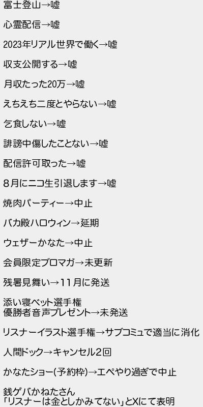 富士登山嘘 心霊配信嘘 年リアル世界で働く嘘 収支公開する嘘 月収たった万嘘 えちえち二度とやらない嘘 乞食しない嘘 誹中傷したことない嘘 配信許可取った嘘 8月にニコ生引退します嘘 焼肉パーティー中止 バカ殿ハロウィン延期 ウェザーかなた中止 会員限定ブロマガ未更新 残暑見舞い11月に発送 添い寝ベット選手権 優勝者音声プレゼント未発送 リスナーイラスト選手権サブコミュで適当に消化 人間ドックキャンセル2回 かなたショー予約枠エペやり過ぎで中止 銭ゲバかねたさん リスナーは金としかみてないとにて表明