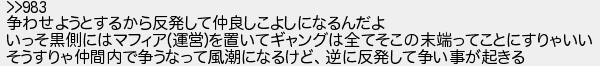 争わせようとするから反発して仲良しこよしになるんだよ いっそ黒側にはマフィア運営を置いてギャングは全てそこの末端ってことにすりゃいい そうすりゃ仲間内で争うなって風潮になるけど逆に反発して争い事が起きる