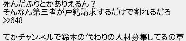 死んだふりとかありえるん? そんなん第三者が戸籍請求するだけで割れるだろ てかチャンネルで鈴木の代わりの人材募集してるの草