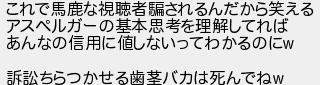 これで馬鹿な視聴者されるんだから笑える アスペルガーの基本思考を理解してれば あんなの信用に値しないってわかるのに 訴訟ちらつかせる歯茎バカは死んでね