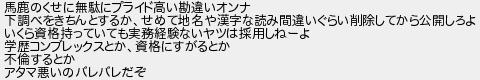 馬鹿のくせに無駄にプライド高い勘違いオンナ 下調べをきちんとするかせめて地名や漢字な読み間違いぐらい削除してから公開しろよ いくら資格持っていても実務経験ないヤツは採用しねーよ 学歴コンブレックスとか資格にすがるとか 不倫するとか アタマ悪いのバレバレだぞ