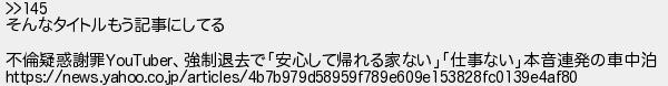 148: (ワッチョイW ffed-QtWK) [] 2025/09/21(日) 08:34:58.08 ID:FIiDA35V0 >>145 そんなタイトルもう記事にしてる 不倫疑惑謝罪YouTuber、強制退去で「安心して帰れる家ない」「仕事ない」本音連発の車中泊 https://news.yahoo.co.jp/articles/4b7b979d58959f789e609e153828fc0139e4af80 http://egg.5ch.net/test/read.cgi/streaming/1753655668/148
