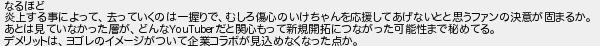 なるほど 炎上する事によって去っていくのは一握りでむしろ傷心のいけちゃんを応援してあげないとと思うファンの決意が固まるか あとは見ていなかった層がどんなだと関心もって新規開拓につながった可能性まで秘めてる デメリットはヨゴレのイメージがついて企業コラボが見込めなくなった点か