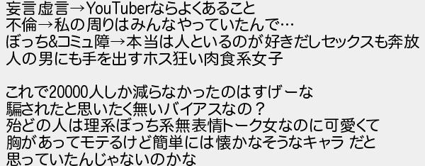 76: (ワッチョイW 0fae-FX3C) [sage] 2025/09/18(木) 03:36:07.49 ID:wWEJIuFz0 妄言虚言→YouTuberならよくあること 不倫→私の周りはみんなやっていたんで… ぼっち&コミュ障→本当は人といるのが好きだしセックスも奔放 人の男にも手を出すホス狂い肉食系女子 これで20000人しか減らなかったのはすげーな 騙されたと思いたく無いバイアスなの? 殆どの人は理系ぼっち系無表情トーク女なのに可愛くて 胸があってモテるけど簡単には懐かなそうなキャラ だと 思っていたんじゃないのかな http://egg.5ch.net/test/read.cgi/streaming/1753655668/76