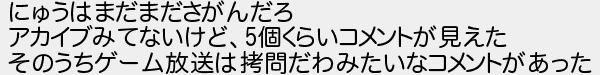 にゅうはまだまださがんだろ アカイブみてないけど個くらいコメントが見えた そのうちゲーム放送は拷問だわみたいなコメントがあった