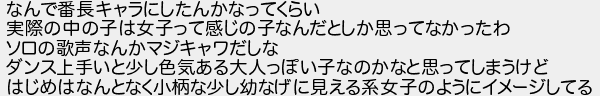 なんで番長キャラにしたんかなってくらい 実際の中の子は女子って感じの子なんだとしか思ってなかったわ ソロの歌声なんかマジキャワだしな ダンス上手いと少し色気ある大人っぽい子なのかなと思ってしまうけど はじめはなんとなく小柄な少し幼なげに見える系女子のようにイメージしてる