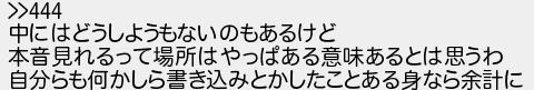 中にはどうしようもないのもあるけど 本音見れるって場所はやっぱある意味あるとは思うわ 自分らも何かしら書き込みとかしたことある身なら余計に