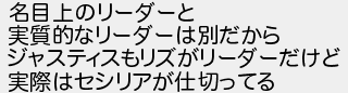 名目上のリーダーと 実質的なリーダーは別だから ジャスティスもリズがリーダーだけど 実際はセシリアが仕切ってる