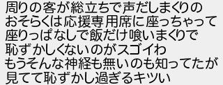 周りの客が総立ちで声だしまくりの おそらくは応援専用席に座っちゃって 座りっぱなしで飯だけ喰いまくりで 恥ずかしくないのがスゴイわ もうそんな神経も無いのも知ってたが 見てて恥ずかし過ぎるキツい