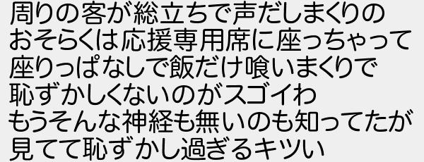 周りの客が総立ちで声だしまくりの おそらくは応援専用席に座っちゃって 座りっぱなしで飯だけ喰いまくりで 恥ずかしくないのがスゴイわ もうそんな神経も無いのも知ってたが 見てて恥ずかし過ぎるキツい