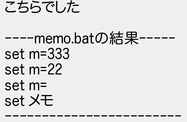 303: [] 2023/06/08(木) 04:54:13.59 ID:qSJ8V+Su こちらでした ----memo.batの結果----- set m=333 set m=22 set m= set メモ ------------------------ http://mevius.5ch.net/test/read.cgi/tech/1663153441/303