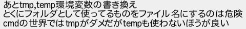 あと環境変数の書き換え とくにフォルダとして使ってるものをファイル名にするのは危険 の世界ではがダメだがも使わないほうが良い