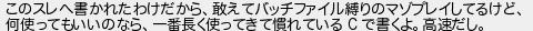 394: [sage] 2023/07/07(金) 14:50:24.72 ID:T33gGQqj このスレへ書かれたわけだから、敢えてバッチファイル縛りのマゾプレイしてるけど、 何使ってもいいのなら、一番長く使ってきて慣れている C で書くよ。高速だし。 http://mevius.5ch.net/test/read.cgi/tech/1663153441/394