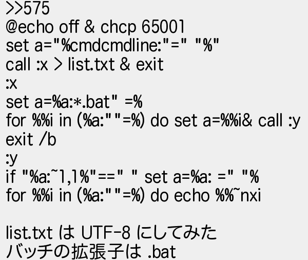 577: [sage] 2024/11/07(木) 07:18:54.75 ID:diE3Ipx6 >>575 @echo off & chcp 65001 set a="%cmdcmdline:"=" "%" call :x > list.txt & exit :x set a=%a:*.bat" =% for %%i in (%a:""=%) do set a=%%i& call :y exit /b :y if "%a:~1,1%"==" " set a=%a: =" "% for %%i in (%a:""=%) do echo %%~nxi list.txt は UTF-8 にしてみた バッチの拡張子は .bat http://mevius.5ch.net/test/read.cgi/tech/1663153441/577