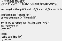 654: [sage] 2025/02/06(木) 21:17:32.84 ID:TFp3Dqlz batで最も重要な構文 これさえマスターすればどんな複雑な処理も書ける set tempfn=%temp%\%random%_%random%_%random%.txt yourcommand "%tempfn%" or yourcommand > "%tempfn%" for /f %%i in (%tempfn%) do call :each "%%~i" del "%tempfn%" goto :eof :each echo eachline:[%*] goto :eof http://mevius.5ch.net/test/read.cgi/tech/1663153441/654