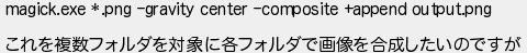 883: [sage] 2025/12/11(木) 17:13:57.24 ID:FGoG9TJ/ magick.exe *.png -gravity center -composite +append output.png これを複数フォルダを対象に各フォルダで画像を合成したいのですが http://mevius.5ch.net/test/read.cgi/tech/1663153441/883