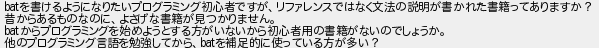 911: [] 2026/02/08(日) 19:34:08.17 ID:k7IV6YGZ batを書けるようになりたいプログラミング初心者ですが、リファレンスではなく文法の説明が書かれた書籍ってありますか? 昔からあるものなのに、よさげな書籍が見つかりません。 batからプログラミングを始めようとする方がいないから初心者用の書籍がないのでしょうか。 他のプログラミング言語を勉強してから、batを補足的に使っている方が多い? http://mevius.5ch.net/test/read.cgi/tech/1663153441/911