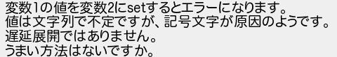 96: [sage] 2022/12/04(日) 15:45:51.56 ID:xdG8GXCM 変数1の値を変数2にsetするとエラーになります。 値は文字列で不定ですが、記号文字が原因のようです。 遅延展開ではありません。 うまい方法はないですか。 http://mevius.5ch.net/test/read.cgi/tech/1663153441/96