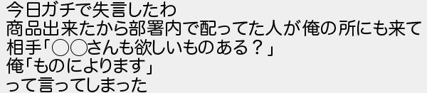 今日ガチで失言したわ 商品出来たから部署内で配ってた人が俺の所にも来て 相手さんも欲しいものある? 俺ものによります って言ってしまった
