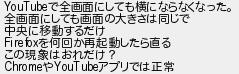 653: (ワッチョイ a37e-8USY) [sage] 2023/05/16(火) 07:27:46.57 ID:ZbplvEu30 YouTubeで全画面にしても横にならなくなった。 全画面にしても画面の大きさは同じで 中央に移動するだけ Firefoxを何回か再起動したら直る この現象はおれだけ? ChromeやYouTubeアプリでは正常 http://egg.5ch.net/test/read.cgi/android/1640174353/653