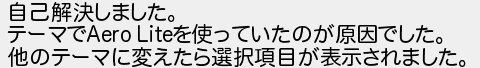 144: [sage] 2025/05/06(火) 00:23:38.05 ID:lukPB6J40 自己解決しました。 テーマでAero Liteを使っていたのが原因でした。 他のテーマに変えたら選択項目が表示されました。 http://egg.5ch.io/test/read.cgi/software/1728355607/144