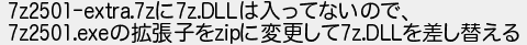 206: [sage] 2025/10/12(日) 13:36:54.10 ID:jwzhoFgo0 7z2501-extra.7zに7z.DLLは入ってないので、 7z2501.exeの拡張子をzipに変更して7z.DLLを差し替える http://egg.5ch.io/test/read.cgi/software/1728355607/206