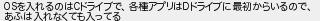 84: [sage] 2025/03/17(月) 23:54:56.12 ID:owQIYkTV0 OSを入れるのはCドライブで、各種アプリはDドライブに最初からいるので、 あふは入れなくても入ってる http://egg.5ch.io/test/read.cgi/software/1728355607/84