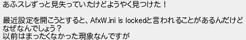 8: [] 2024/11/02(土) 23:22:03.73 ID:IZSwiA0Y0 あふスレずっと見失っていたけどようやく見つけた! 最近設定を開こうとすると、AfxW.ini is lockedと言われることがあるんだけど なぜなんでしょう? 以前はまったくなかった現象なんですが http://egg.5ch.io/test/read.cgi/software/1728355607/8