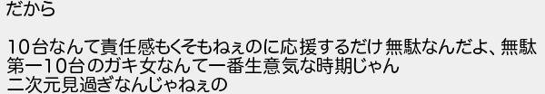 だから 10台なんて責任感もくそもねぇのに応援するだけ無駄なんだよ無駄 第一10台のガキ女なんて一番生意気な時期じゃん 二次元見過ぎなんじゃねぇの