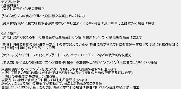 テンプレ比較 基礎項目 音感 音程やピッチの正確さ リズム感ノリの良さグルーヴ感様な楽曲での対応力 発声喉を開いて腹式呼吸や各部共鳴がしっかり出来ているか滑舌は良いか母国語以外の発音は無視 加点項目 声域 実声で歌えるキーの最低音から最高音までの幅 裏声やシャウト瞬間的な高音は含まず 難曲 明確に難度の高い曲を一定以上の質で歌えているか難曲に認定されても歌の質が一定以下では加点も減点もなし 声域難曲のどちらかつで可 テクニックシャウトフェイクビブラートファルセットロングトーンなどの装飾的な技術力 表現力 歌い回しの熟練度センス強弱抑揚等 主観が出やすいのでテンプレ歌唱力についてで補足 異論反論などもこのテンプレを使うとみんな反応しやすく議論が速やかに進みます 決して意見の際に必須というわけではありませんランク変動のための詳細意見には必要 項目の重要度は基礎項目加点項目 表現力はおまけですが上位に関してはむしろ重要視されます ジャンルによって項目の重要度が変動していることがあるのでログ参照 音感についてはピッチ補正もありき補正と思われる場合は数曲同レベルの音源が続けば抽出