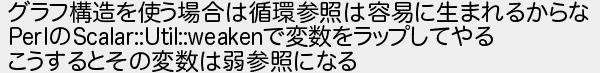 653: (ワッチョイ 09f0-d20A) [sage] 2024/03/24(日) 19:10:42.18 ID:9Ye9tMrz0 グラフ構造を使う場合は循環参照は容易に生まれるからな PerlのScalar::Util::weakenで変数をラップしてやる こうするとその変数は弱参照になる http://mevius.5ch.io/test/read.cgi/tech/1698653580/653