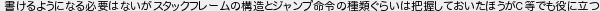 書けるようになる必要はないがスタックフレームの構造とジャンプ命令の種類ぐらいは把握しておいたほうが等でも役に立つ