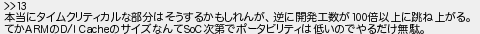 18: [sage] 2025/02/25(火) 16:55:28.68 ID:nAGoBf3b >>13 本当にタイムクリティカルな部分はそうするかもしれんが、逆に開発工数が100倍以上に跳ね上がる。 てかARMのD/I CacheのサイズなんてSoC次第でポータビリティは低いのでやるだけ無駄。 http://mevius.5ch.io/test/read.cgi/tech/1740044708/18