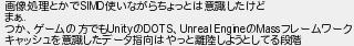 20: [sage] 2025/02/25(火) 21:53:34.63 ID:VO4hwLWp 画像処理とかでSIMD使いながらちょっとは意識したけど まぁ.. つか、ゲームの方でもUnityのDOTS、Unreal EngineのMassフレームワーク キャッシュを意識したデータ指向はやっと離陸しようとしてる段階 http://mevius.5ch.io/test/read.cgi/tech/1740044708/20