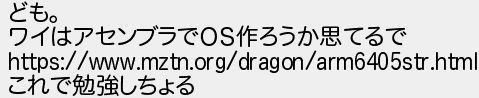 2: 自作OSつくりたい [] 2025/02/20(木) 18:53:55.68 ID:3zBDmm1m ども。 ワイはアセンブラでOS作ろうか思てるで https://www.mztn.org/dragon/arm6405str.html これで勉強しちょる http://mevius.5ch.io/test/read.cgi/tech/1740044708/2