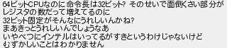 ビットなのに命令長はビット そのせいで面倒くさい部分が レジスタの数だって増えてるのに ビット固定がそんなにうれしいんかね まあきっとうれしいんでしょうなあ いやべつにインテルはいってるがすきというわけじゃないけど むずかしいことはわかりません