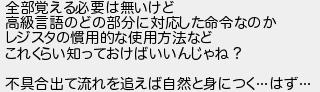 全部覚える必要は無いけど 高級言語のどの部分に対応した命令なのか レジスタの慣用的な使用方法など これくらい知っておけばいいんじゃね? 不具合出て流れを追えば自然と身につくはず