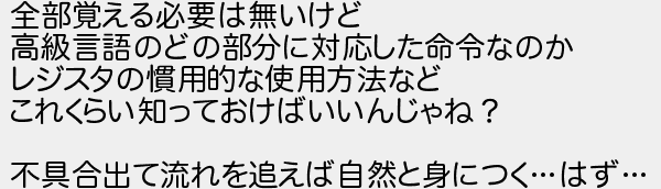 全部覚える必要は無いけど 高級言語のどの部分に対応した命令なのか レジスタの慣用的な使用方法など これくらい知っておけばいいんじゃね? 不具合出て流れを追えば自然と身につくはず