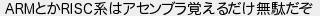 5: [sage] 2025/02/23(日) 20:21:27.14 ID:Bg9OstXm ARMとかRISC系はアセンブラ覚えるだけ無駄だぞ http://mevius.5ch.io/test/read.cgi/tech/1740044708/5