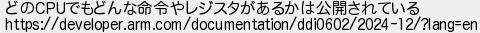 6: [] 2025/02/23(日) 22:31:15.46 ID:7B4X9MSl どのCPUでもどんな命令やレジスタがあるかは公開されている https://developer.arm.com/documentation/ddi0602/2024-12/?lang=en http://mevius.5ch.io/test/read.cgi/tech/1740044708/6